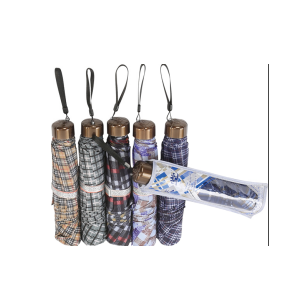商品名稱: 高密隱格聚酯紡三折晴雨傘 規 格: 57cm×7k 條 碼: 6-912003-043394 箱子尺寸: 455mm×275mm×260mm 裝箱數量: 60把 裝箱重量: 16.61±0.1kg/箱