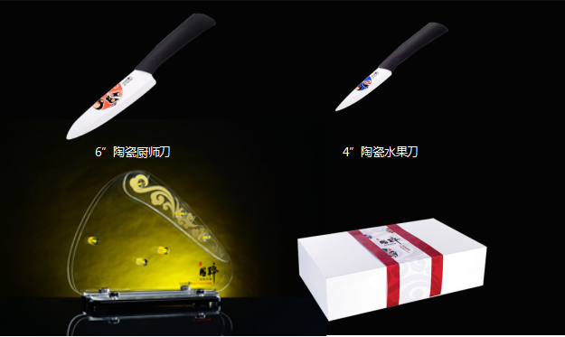 印花水果刀、亞克力刀座、陶瓷刨(贈品)、禮盒包裝(配手提袋)。