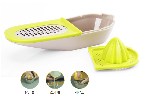 產品說明 (Description) 作為一個多功能組合設計,刨絲與榨汁相結合,配上存儲容器。以船來衍生整體造型。方便、實用來體現產品的設計理念 。
